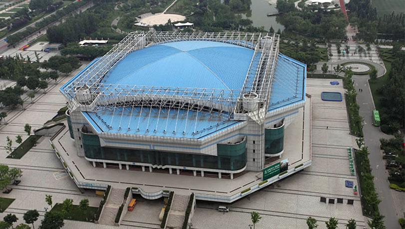 西安市體育館于1997年開(kāi)始建設(shè),1999年8月竣工。它是西安體育中心的標(biāo)志性建筑,先后承辦了第四屆城市運(yùn)動(dòng)會(huì)體操比賽和閉幕式,中國(guó)東西部經(jīng)濟(jì)合作與貿(mào)易洽談會(huì)開(kāi)幕式等活動(dòng)。采用寶鋼海藍(lán)PE聚酯彩涂。基板為180克/平方米的熱鍍鋅,牌號(hào)為T(mén)St01。使用了12年后,涂層顏色依然鮮艷.