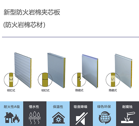 巖棉夾芯板是選用兩層高品質(zhì)的彩涂涂層鋼板或其他精密壓型的金屬板做面板,輥壓成型 后,將分條后的巖棉90度旋轉(zhuǎn)(使其纖維垂直于上下兩層鋼板),通過高強度、高粘結(jié)力、 高防火的粘結(jié)劑,將優(yōu)質(zhì)巖棉與金屬板粘結(jié)、復(fù)合而成美觀、平整、剛韌的建筑板材