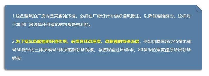 行業特點:有色金屬冶煉廠(銅、鋅、鋁、鉛等)是最挑戰彩板使用年限的,鋼廠、電廠等也會產生腐蝕性的介質,對彩涂板的抗腐蝕要求較高。