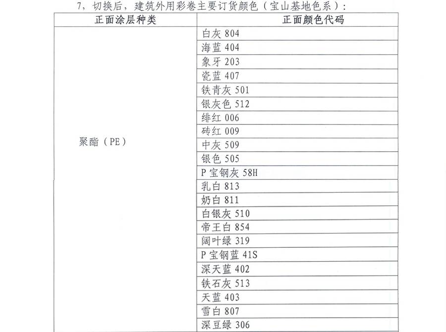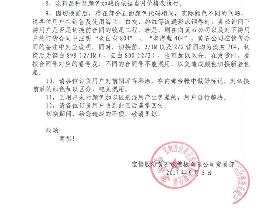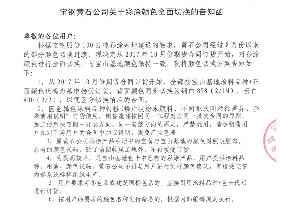 9月5日,寶鋼黃石發布了《寶鋼黃石公司關注彩涂顏色全面切換的告知函》,其告知函全文如下:
