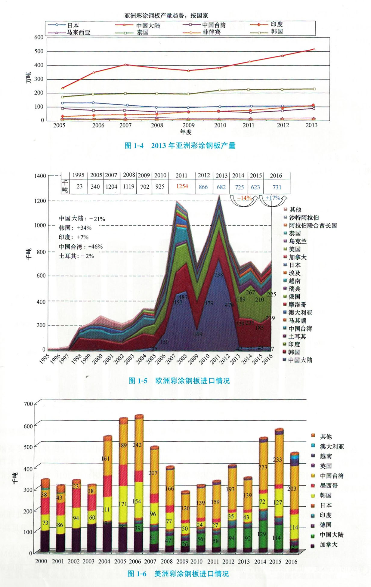 近年來,亞洲彩涂鋼板產量總體呈上升趨勢(圖1-4)。其中,中國大陸上升趨勢明顯,印度次之。2013年中國大陸彩涂鋼板產量超過500萬噸。由于亞洲產能的迅速增加,使大量產品流向歐美,影響了全球的彩涂鋼板產品市場。近二十多年進口到歐洲的彩涂鋼板量見圖1-5,2016年歐洲進口彩涂鋼板約73萬噸,主要來自韓國和印度:近十多年進口到美洲的彩涂鋼板量見圖1-6,2016年美國進口彩涂鋼板約45萬噸,主要來自韓國和中國臺灣。2013年以來中國大陸在這兩個主要市場的出口均因反傾銷而基本退出。