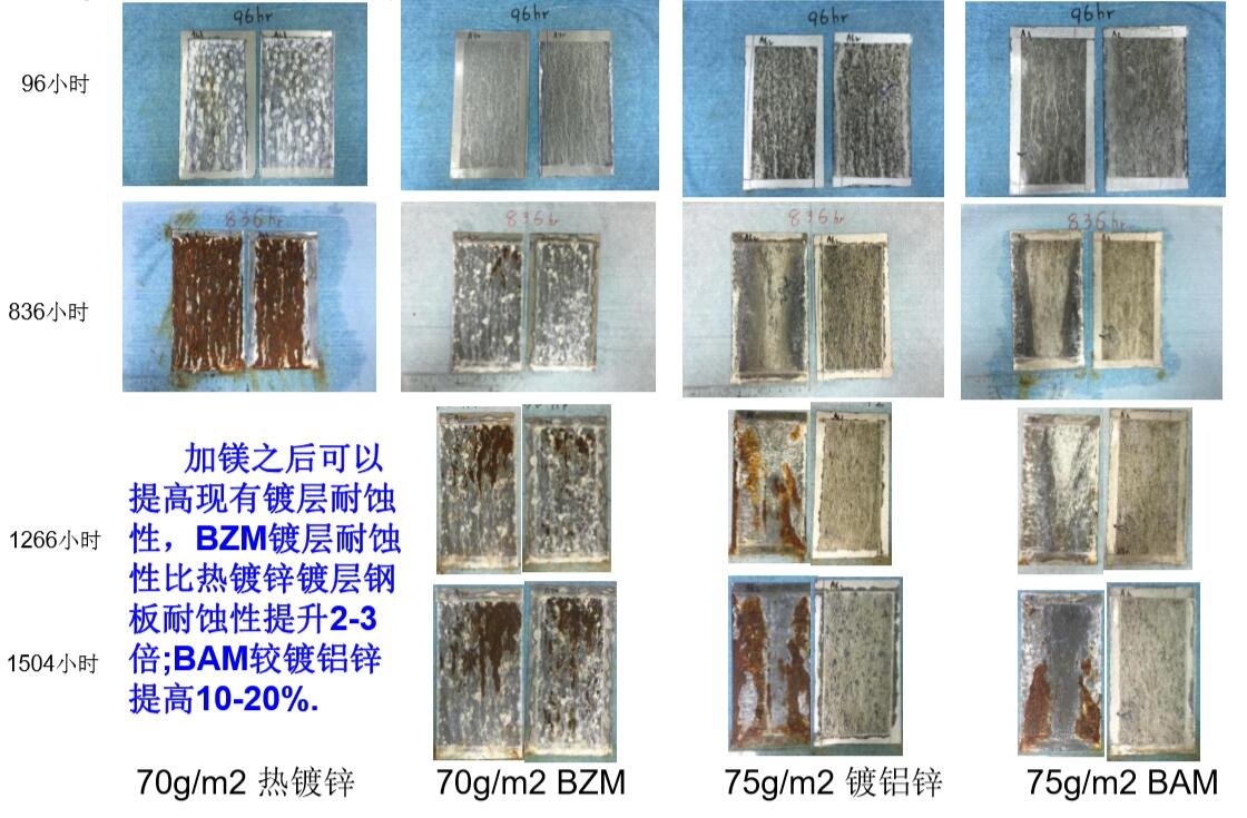 最大的優點是耐蝕性,公開的實驗室加速實驗、戶外暴露實驗等結果表明,一定范圍內Al、Mg含量增加會提高耐蝕性幾倍到十幾倍.