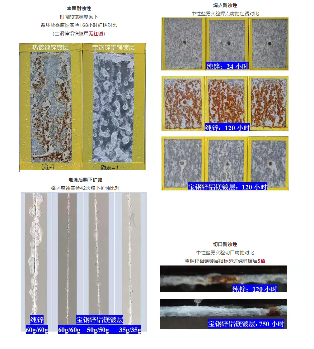 與現有的熱鍍純鋅、熱鍍鋅鐵合金及電鍍鋅汽車板相比,寶鋼鋅鋁鎂鍍層汽車板具有更高的耐蝕性及更好的成形性。