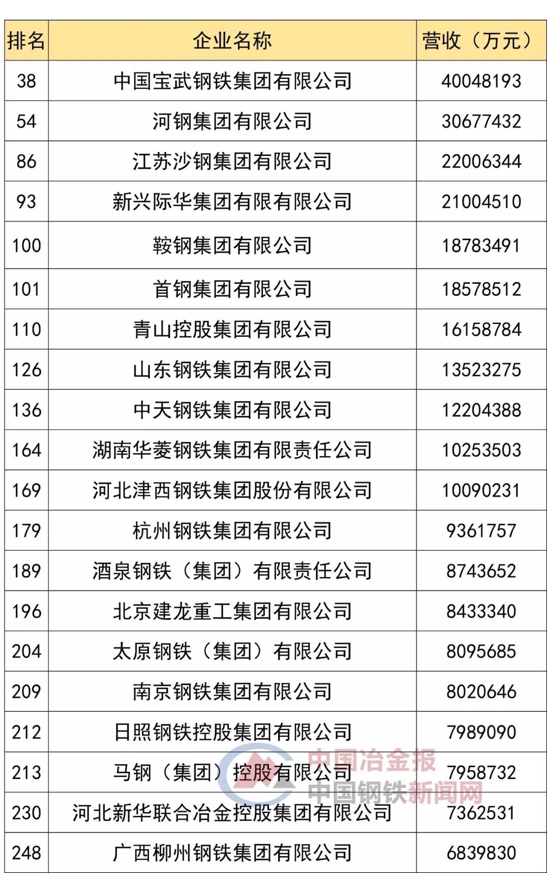 9月2日,由中國企業(yè)聯(lián)合會、中國企業(yè)家協(xié)會連續(xù)第17次向社會公開發(fā)布的“中國企業(yè)500強(qiáng)”排行榜今日在西安揭曉。47家鋼鐵企業(yè)入選。其中中國寶武、河鋼集團(tuán)、沙鋼集團(tuán)分別以營收4004億元、3067億元、2200億元位居鋼鐵板塊前三名。在500強(qiáng)榜單中,分別排名為38位、54位、86位。