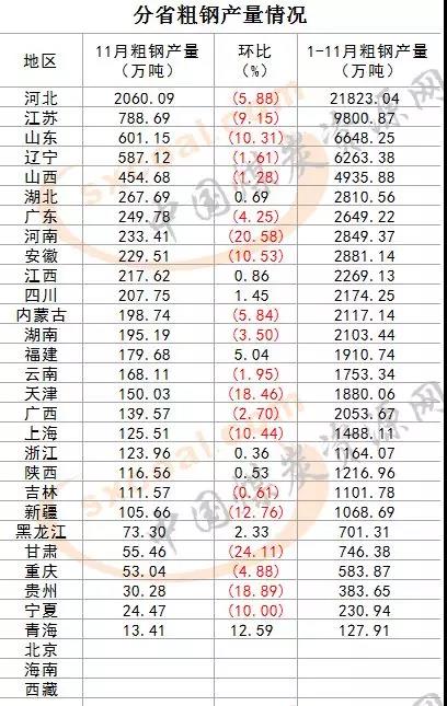 國家統(tǒng)計局近日公布了2018年11月份全國規(guī)模以上工業(yè)分省粗鋼產(chǎn)量,數(shù)據(jù)顯示,11月份,單月粗鋼產(chǎn)量500萬噸以上的冀蘇魯遼4省,合計生產(chǎn)粗鋼4037.1萬噸,占全國總產(chǎn)量的52.0%。統(tǒng)計的31個省區(qū)中,有20個省區(qū)粗鋼產(chǎn)量環(huán)比下降,其中14個省區(qū)降幅大于全國6.0%的平均水平。